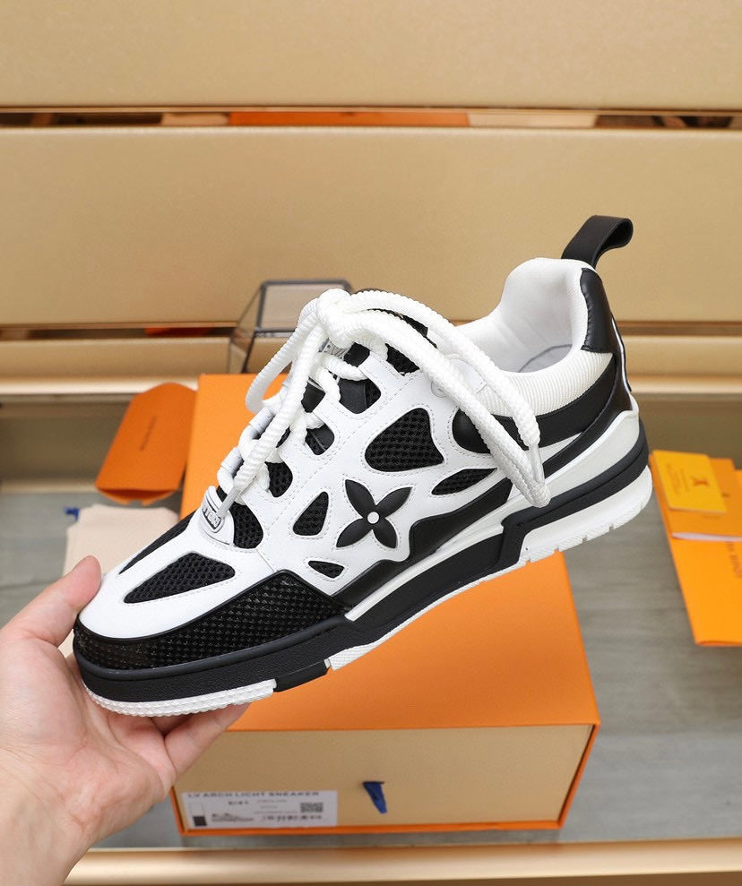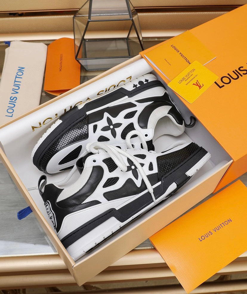 O tênis LV Skate faz referência a um design inspirado nos anos 90, visto pela primeira vez no desfile masculino Fall-Winter 2022 da Louis Vuitton. Seu elaborado cabedal bicolor com detalhes em Monogram Flower combina malha técnica, couro de bezerro e camurça. Este modelo se destaca pelo colarinho acolchoado, cadarços duplos técnicos e solado de borracha bicolor decorado com Monogram Flowers.